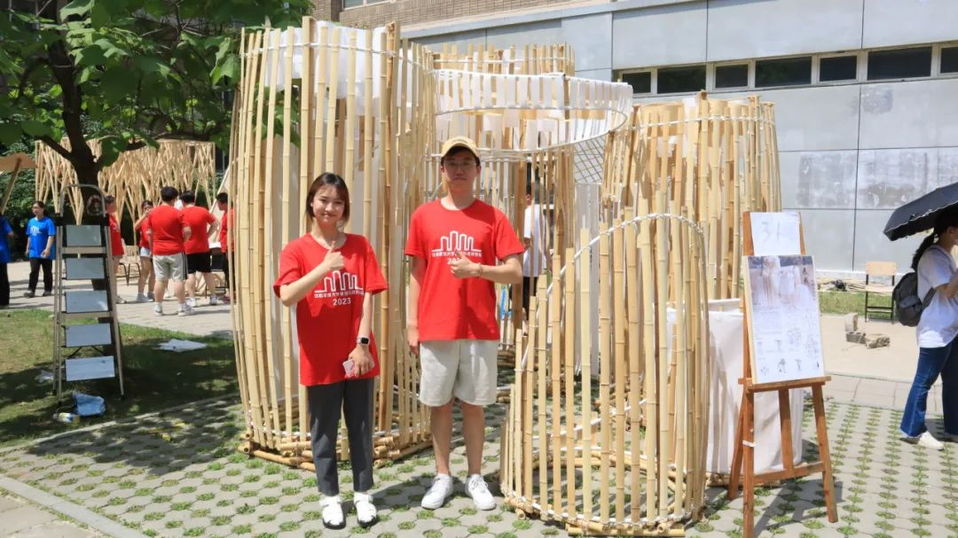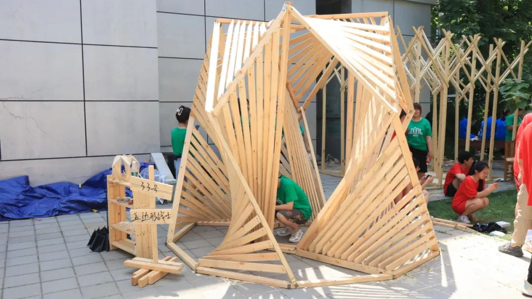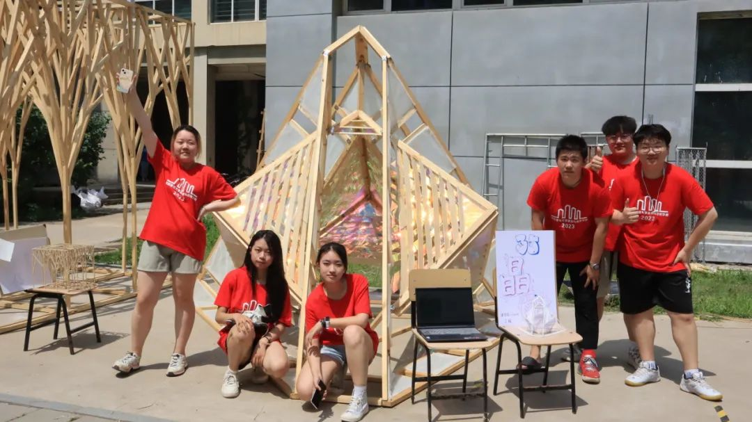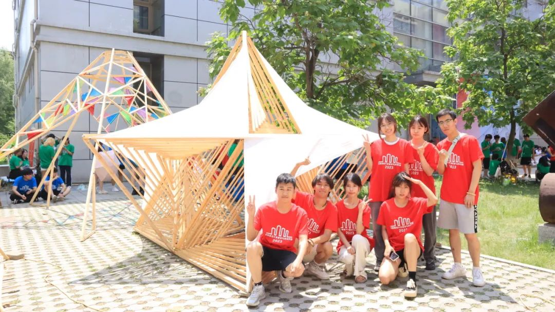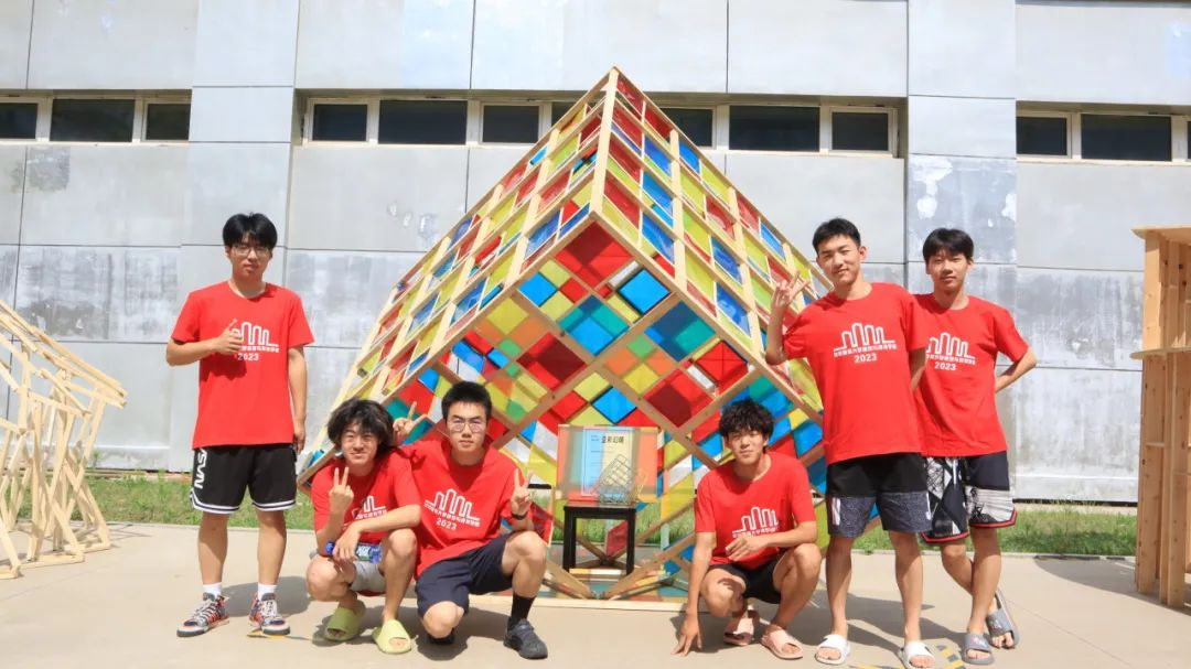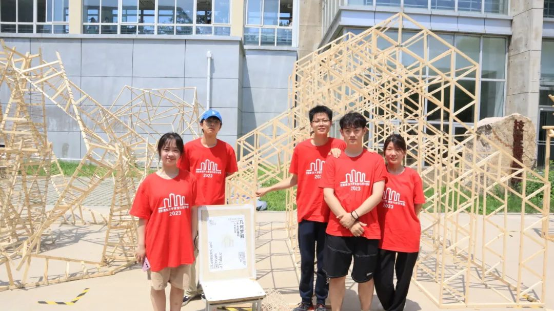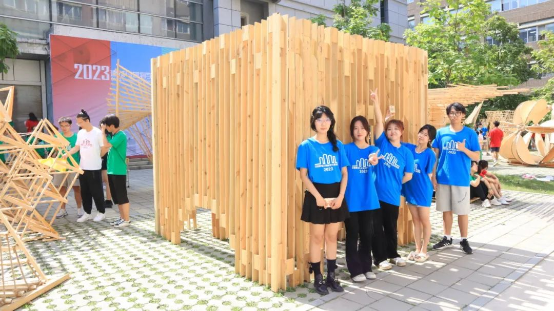 各代表队在搭建竞赛现场中争分夺秒,全力以赴,力求完成满意的作品。尽管搭建期间受到雷雨和酷暑影响,但各小组克服重重困难,互帮互助,最终将设计方案顺利建成落地。追求源于热爱,热爱成就追求。建院学子们将设计成果精益求精的追求成就了一份份佳作,成就了一张张笑颜。