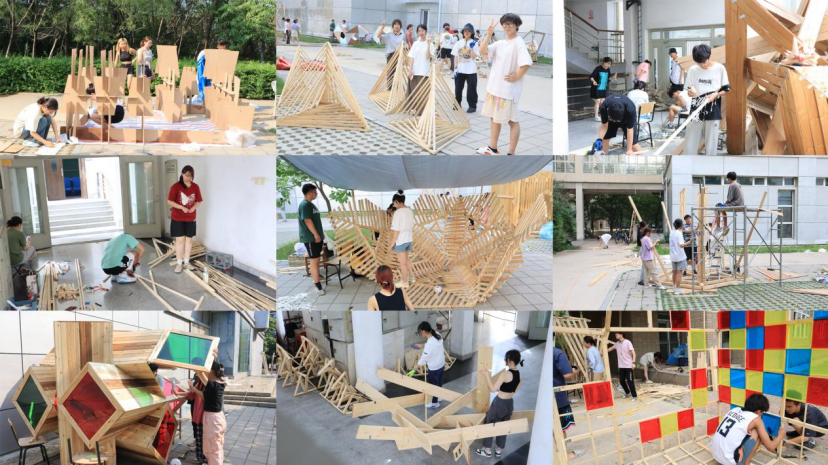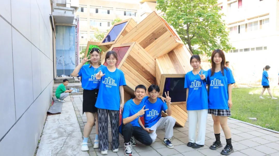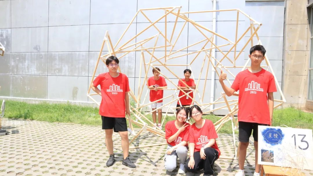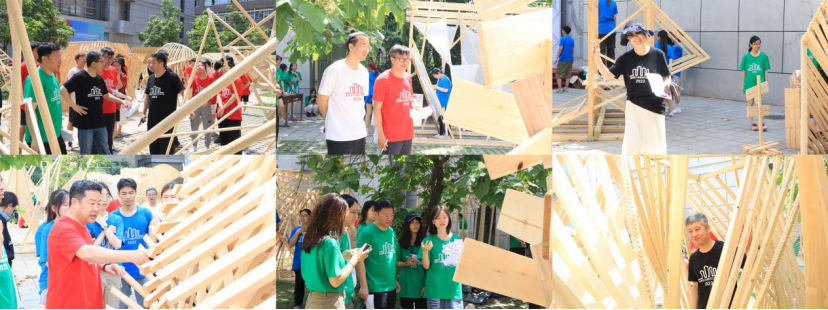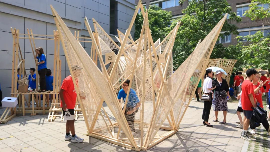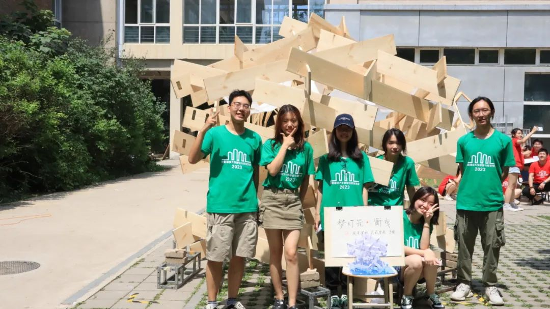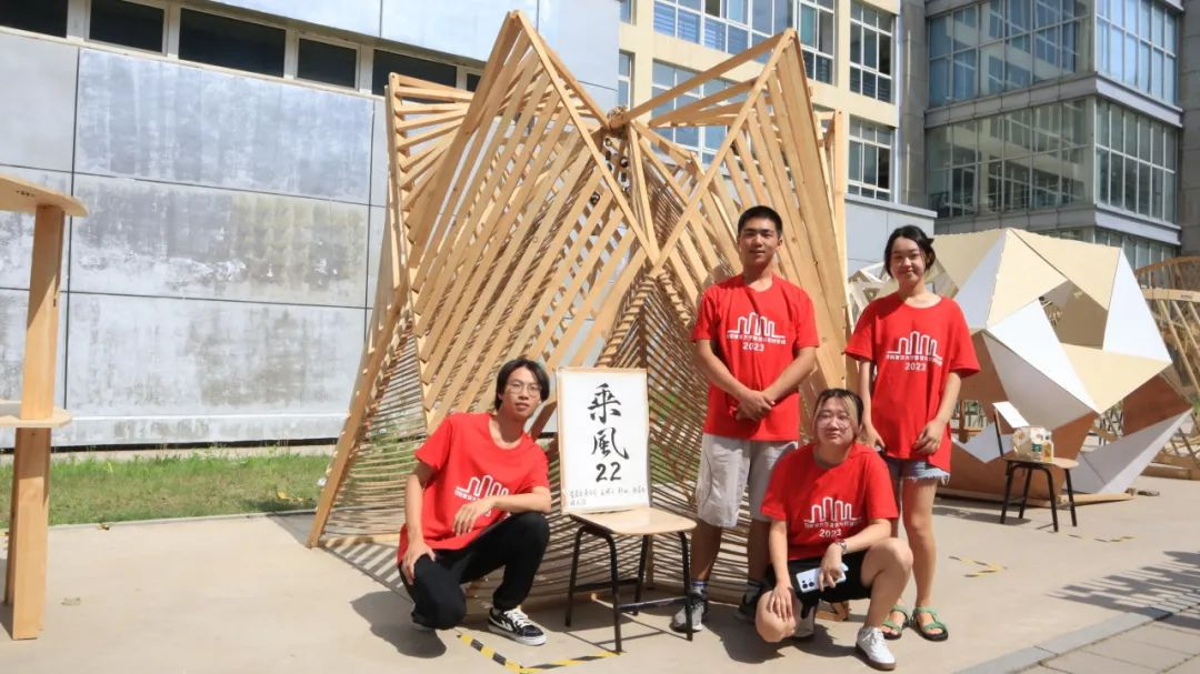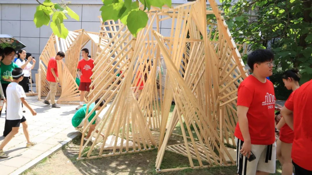 各代表队在搭建竞赛现场中争分夺秒,全力以赴,力求完成满意的作品。尽管搭建期间受到雷雨和酷暑影响,但各小组克服重重困难,互帮互助,最终将设计方案顺利建成落地。追求源于热爱,热爱成就追求。建院学子们将设计成果精益求精的追求成就了一份份佳作,成就了一张张笑颜。