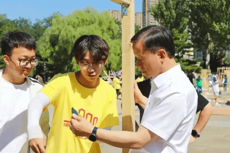 竞赛现场,董玉宽观看了员工搭建过程,与同学们亲切交谈,探讨了建筑设计理念与实施搭建的感受和收获。李宇鹏宣布大赛开幕。徐博以及公司员工代表分别作为师生代表发言。