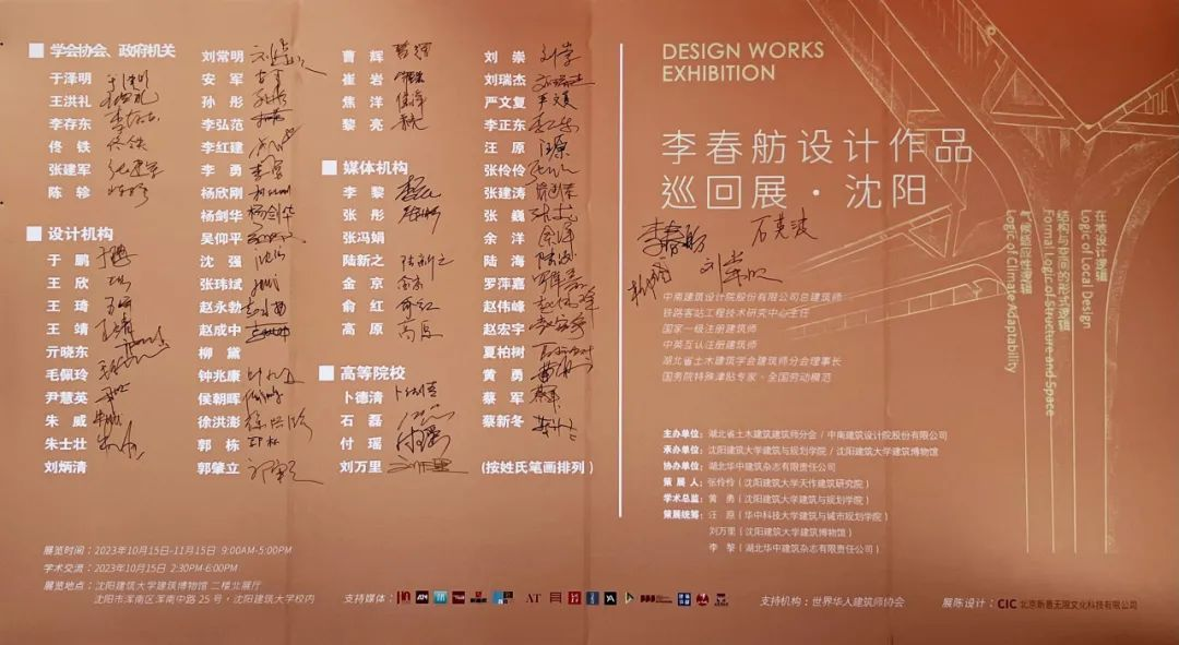 李春舫总建筑师深耕建筑创作、技术创新与绿色设计30余年,设计作品遍布海内外,屡获国内外设计大奖,在高铁站房、机场航站、体育场馆及博物馆等大型公共建筑领域具有深厚的造诣、突出的成就和重大的贡献。李春舫设计作品巡回展由湖北省土木建筑建筑师分会、中南建筑设计院股份有限公司主办,《华中建筑》杂志社协办,自2023年4月开始,相继在武汉、深圳、广州、上海、天津五个城市举办,沈阳站是巡回展的最后一站。本站展览由全国工程勘察设计大师张伶伶担任策展人,williamhill英国官网经理黄勇担任学术总监,华中科技大学教授汪原、williamhill官网建筑博物馆副馆长刘万里、《华中建筑》杂志社执行总监李黎统筹策划,williamhill英国官网和建筑博物馆共同承办。