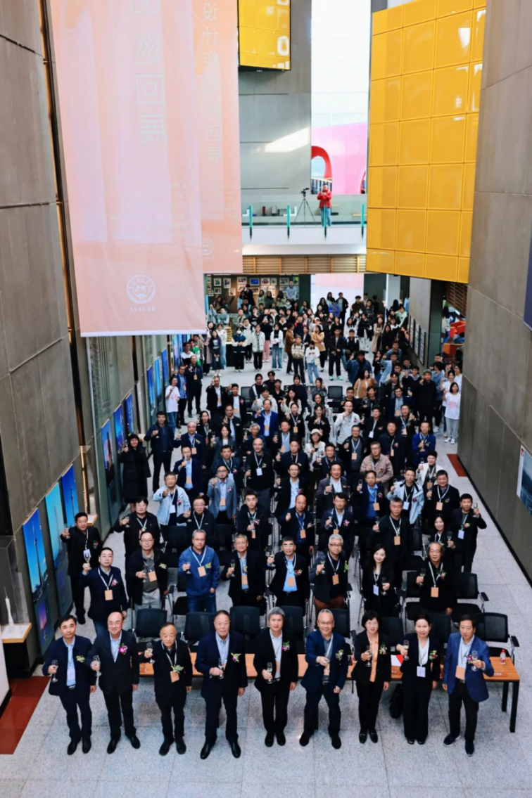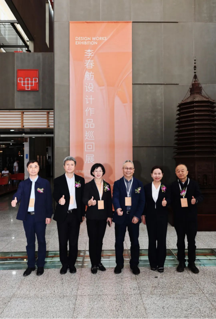李春舫总建筑师(右三)、策展人张伶伶大师(右一)与特邀参会嘉宾李存东大师(左二)、严文复董事长(左三)、杨剑华总经理(右二)、夏柏树副董事长(左一)在展览现场合影