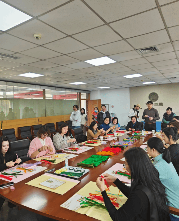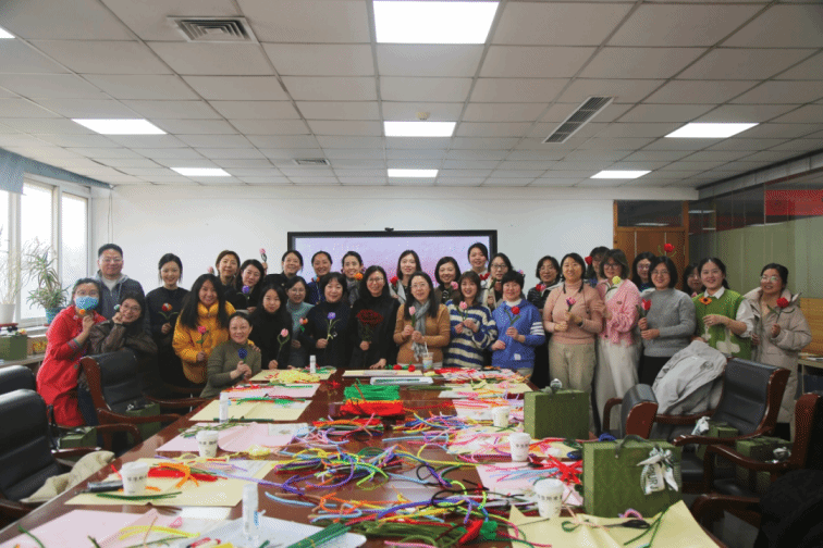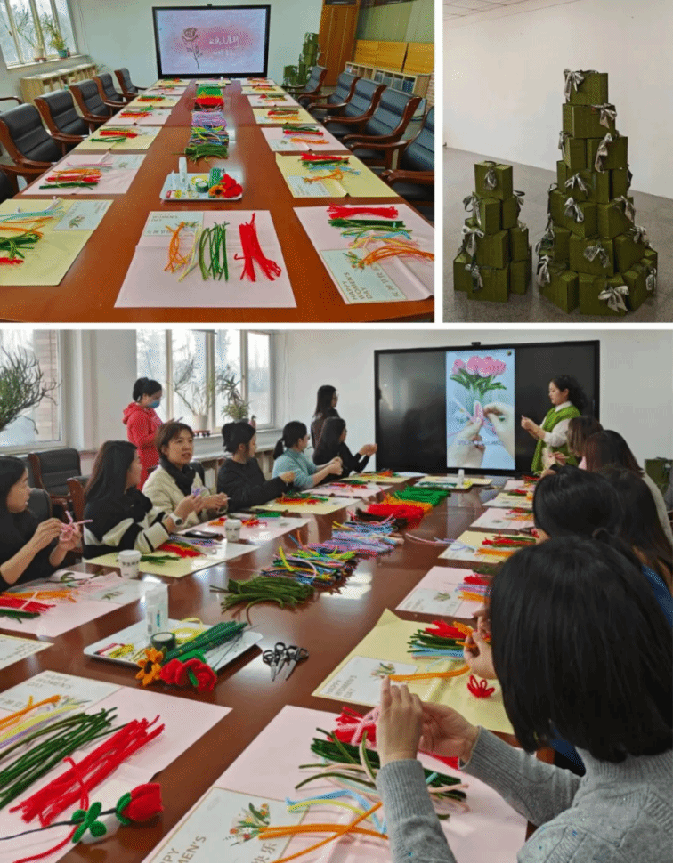 本次活动的内容是用“扭扭棒”手工制作花朵,女教师们观看教程动手操作,将各种颜色的“扭扭棒”通过精心配搭制作成一枝枝彰显个人审美且独具意义的花朵。一枝枝各不相同的花朵融合成一捧捧赏心悦目、独具匠心的花束。女教师们互相交流技法,体会手工制作的魅力,如辛勤的园丁一样将美好在指尖绽放。