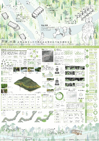 随着社会的发展,逃离都市喧嚣、寻求自然疗愈成为新趋势,自然风景区日益受到青睐。项目选址在有着丰富自然声景资源的本溪大石湖风景区,经过前期深入调研,我们发现大石湖风景区内声景同质化现象显著,游客体验趋于单一。为解决此问题,我们规划游览路线为开端、过渡、高潮与尾声四段,并每个段落中选取了游客密度高、声景资源丰富且水景具有代表性的关键节点,进行针对性设计。
