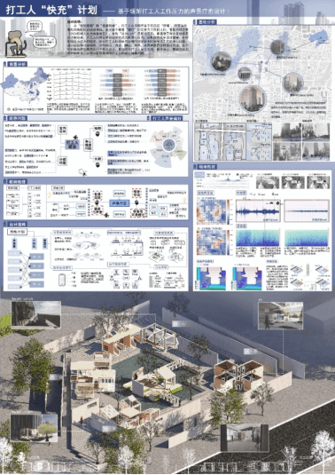 在这个快节奏的时代,职场打工人似乎总是与时间赛跑,过载忙碌的工作让他们压力倍增。大部分的打工人,认为在职场中受到的压力程度过大,并且没有一个良好的疗愈自己的环境。因此,我们将职场打工人的缓解压力需求作为切入点,设计职场打工人“快充”计划,以沈阳金廊商圈华润大厦为场地选址,提供解决方案。调研显示,超半数存在加班压力、脑力过载和情绪负荷等问题。因此我们采用声景疗愈措施,通过空间声学设计、自然声引入、听觉与语音互动、智慧化技术等措施,运用恢复性环境理论作为支撑展开设计。