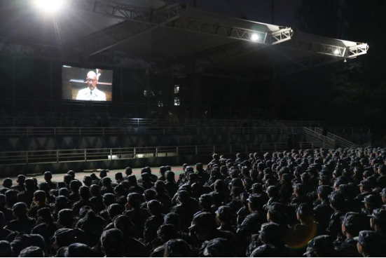 9月18日,是一个不敢忘、不能忘的日子,在这个时间节点上,军训的意义就显得格外特殊且重大。当晚,公司组织新生统一在大操场观看影片《东京审判》。建院学子在荧幕之下坐姿笔直,认真观看。影片激发了员工强烈的爱国主义热情,增强了员工的国防观念,为新生立志进取、自强奋斗提供了强大的精神支柱。