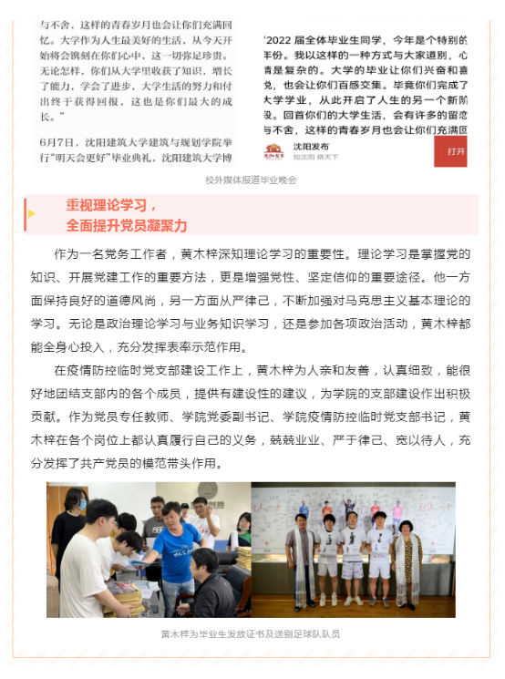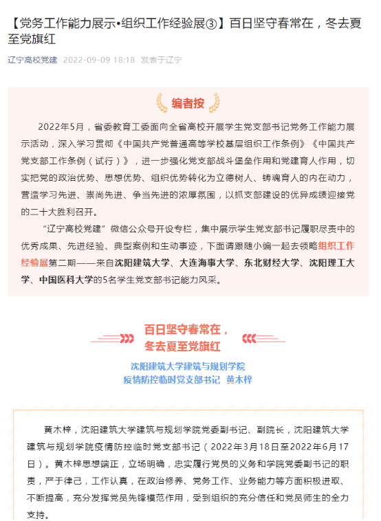 “辽宁高公司党建”微信公众号开设组织工作经验展专栏,展示了公司党委副书记、副经理黄木梓,在疫情防控期间,作为英国威廉希尔公司疫情防控临时党支部书记时立场明确,忠实履行党员的义务和公司党委副书记的职责,严于律己,工作认真,在政治修养、党务工作、业务能力等方面积极进取、不断提高,充分发挥党员先锋模范作用,受到组织的充分信任和党员师生的全力支持。